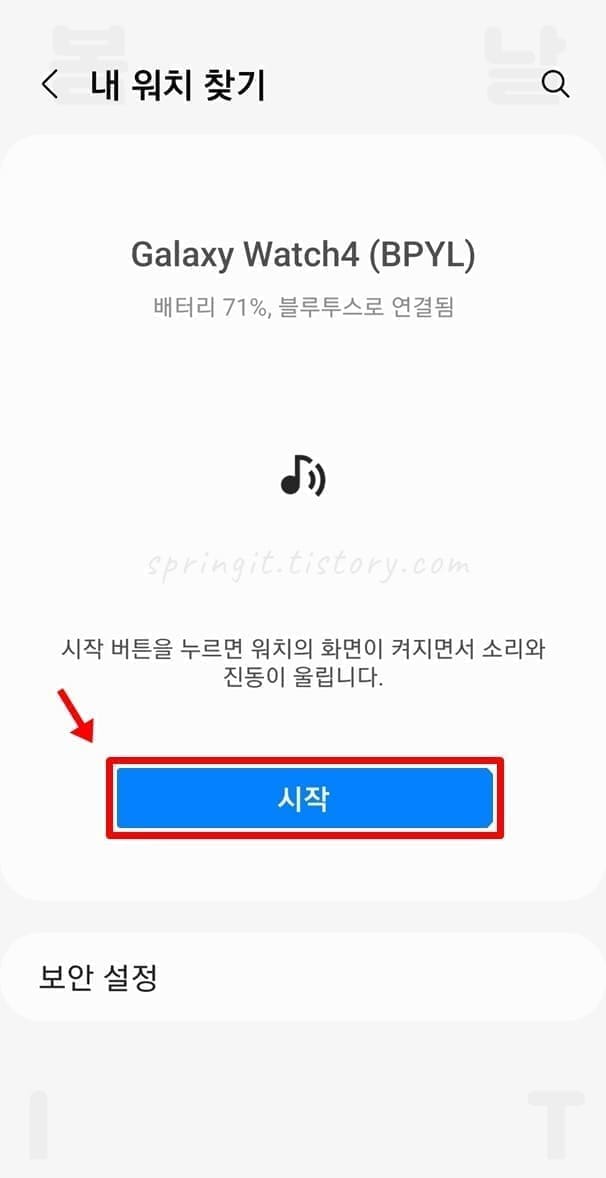 시작 버튼을 누르면 갤럭시 워치의 화면이 켜지면서 소리와 진동 울리게 됩니다.