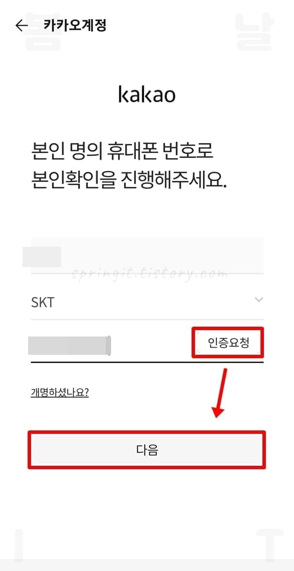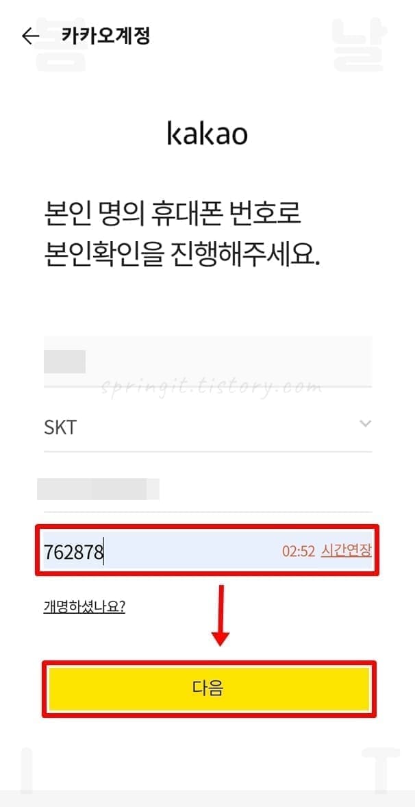 23. 문자로 수신된 인증번호를 입력하고 다음을 누릅니다.