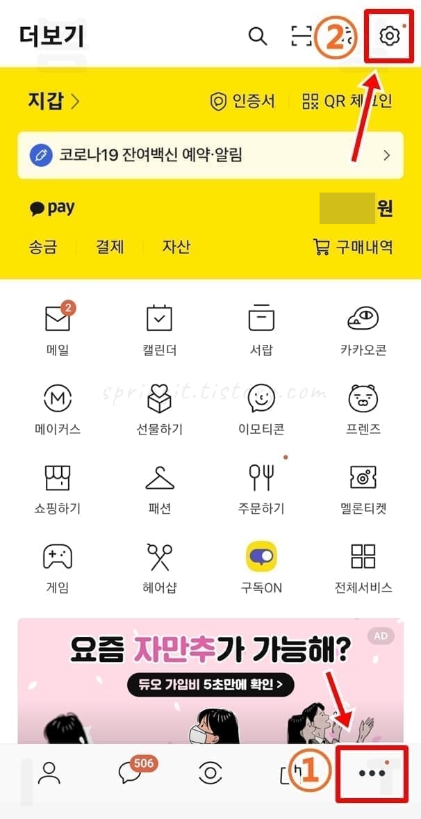 1. 카톡 더보기 > 톱니바퀴 버튼을 클릭합니다.