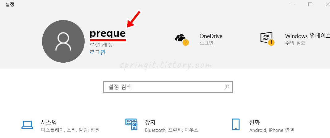 또한 윈도우 설정을 들어가보시면 현재 로그인된 로컬 계정의 이름이 상단부에 표시됩니다. 저의 겨우에는 [preque]로 설정이 되어 있는데 이러한 로컬 계정의 이름은 아래 방법으로 가장 쉽고 간단하게 바꿔줄 수 있습니다.