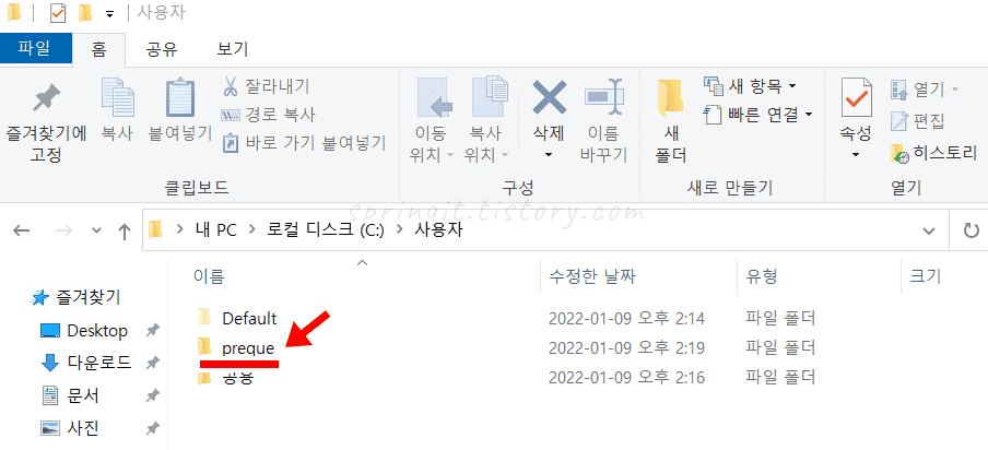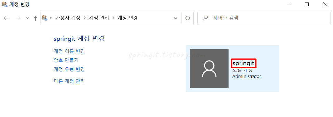 저의 경우 기존의 preque를 springit로 바꾼 모습입니다. 계정 변경 페이지 우측에서 바꿔진 이름을 곧바로 확인할 수 있습니다. 참고로 설정페이지와 사용자 폴더명의 변경은 컴퓨터를 재시작해야 원할하게 적용되니 참고해주시길 바랍니다.