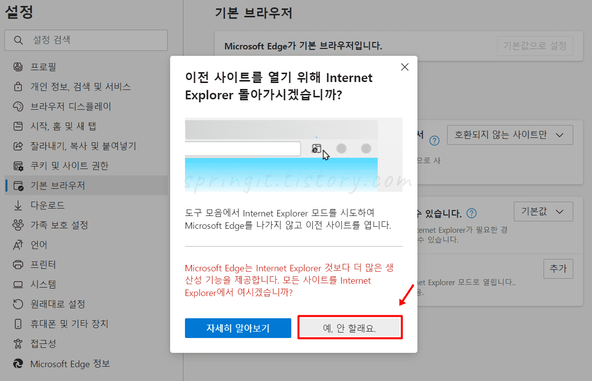 7. 모든 사이트를 Internet Explorer에서 여시겠습니까 팝업에 예, 안할래요를 클릭합니다.