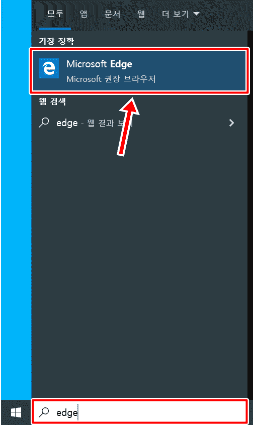 바탕화면에 엣지 브라우저 아이콘이 있다면 더블클릭하셔도 되고 바로가기 아이콘을 못찾으시겠다면 저와 같이 작업표시줄 검색창에서 edge를 검색해서 실행해주시면 되겠습니다.