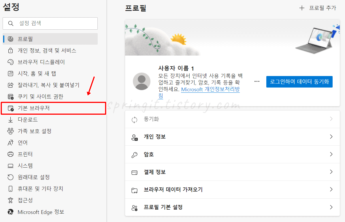 4. 좌측 카테고리에서 기본 브라우저를 클릭합니다.