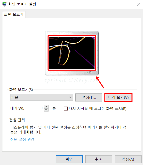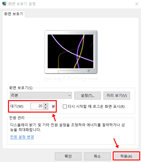 10. 적용을 클릭하면 윈도우 화면보호기가 설정됩니다.