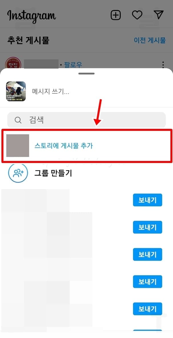이번에는 내가 아닌 다른 사람이 올린 게시물을 내 팔로우 친구들에게 보여주도록 스토리에 공유하는 방법을 알아보겠습니다.