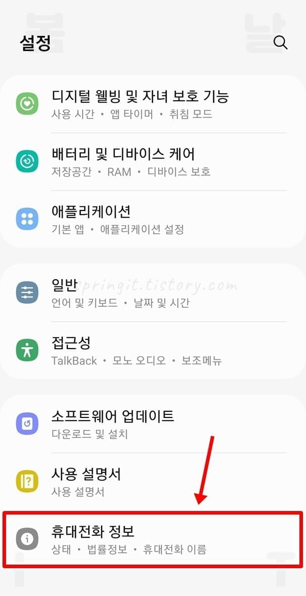 1. 갤럭시 설정 어플에서 휴대전화 정보를 클릭합니다.
