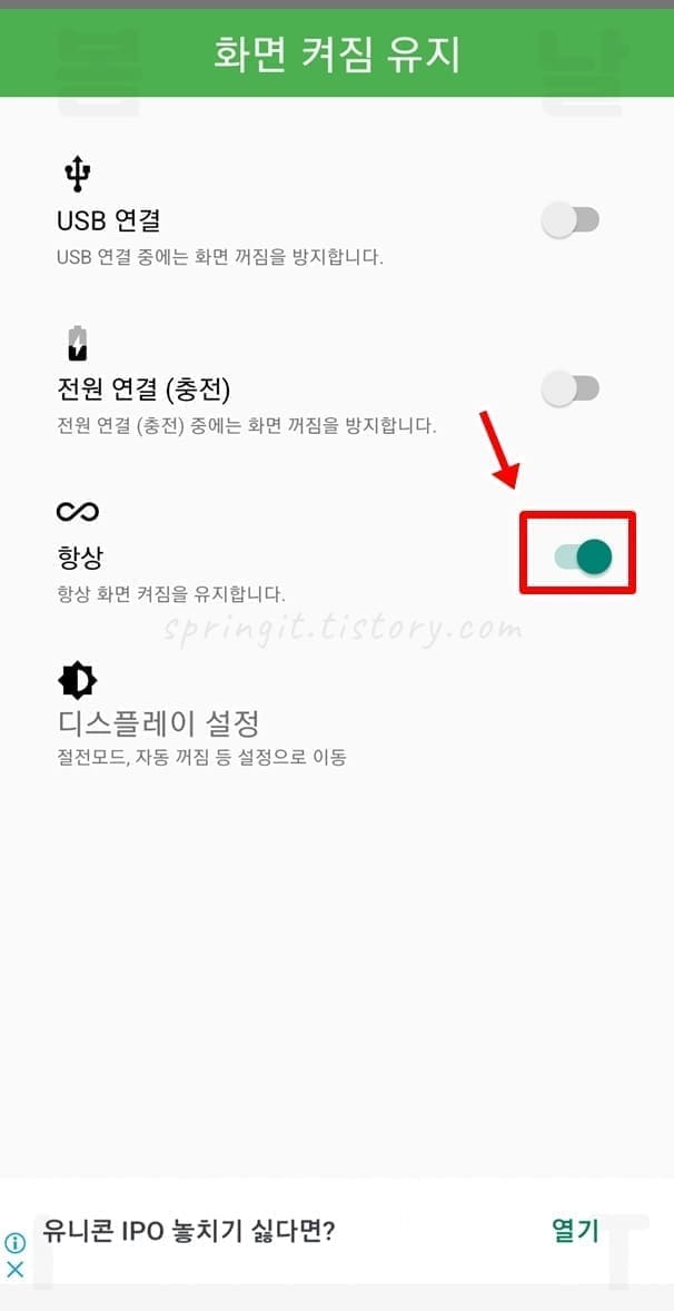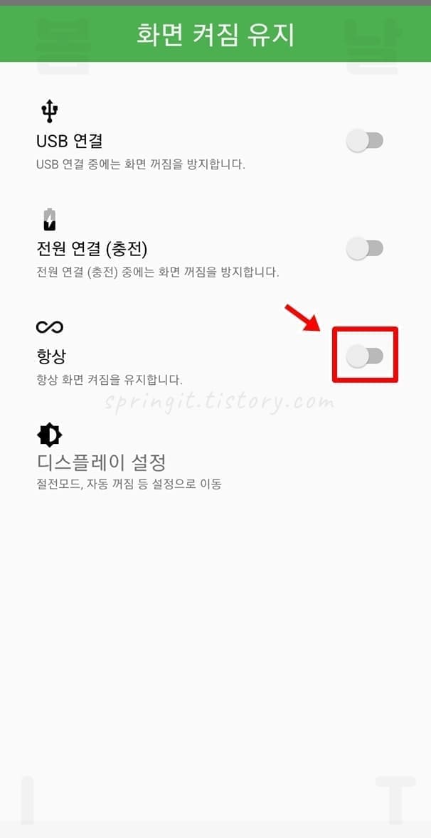 - 항상: 항상 화면을 켜짐상태로 유지해줌.