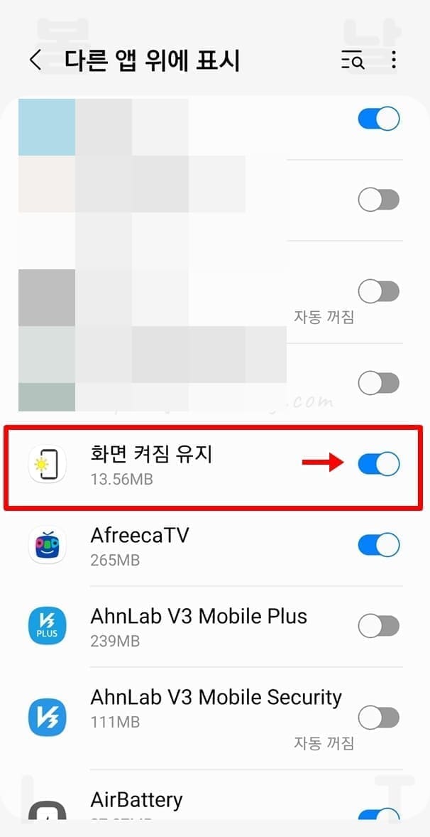 4. 이동된 다른 앱 위에 표시에서 화면 켜짐 유지 앱을 활성화합니다.