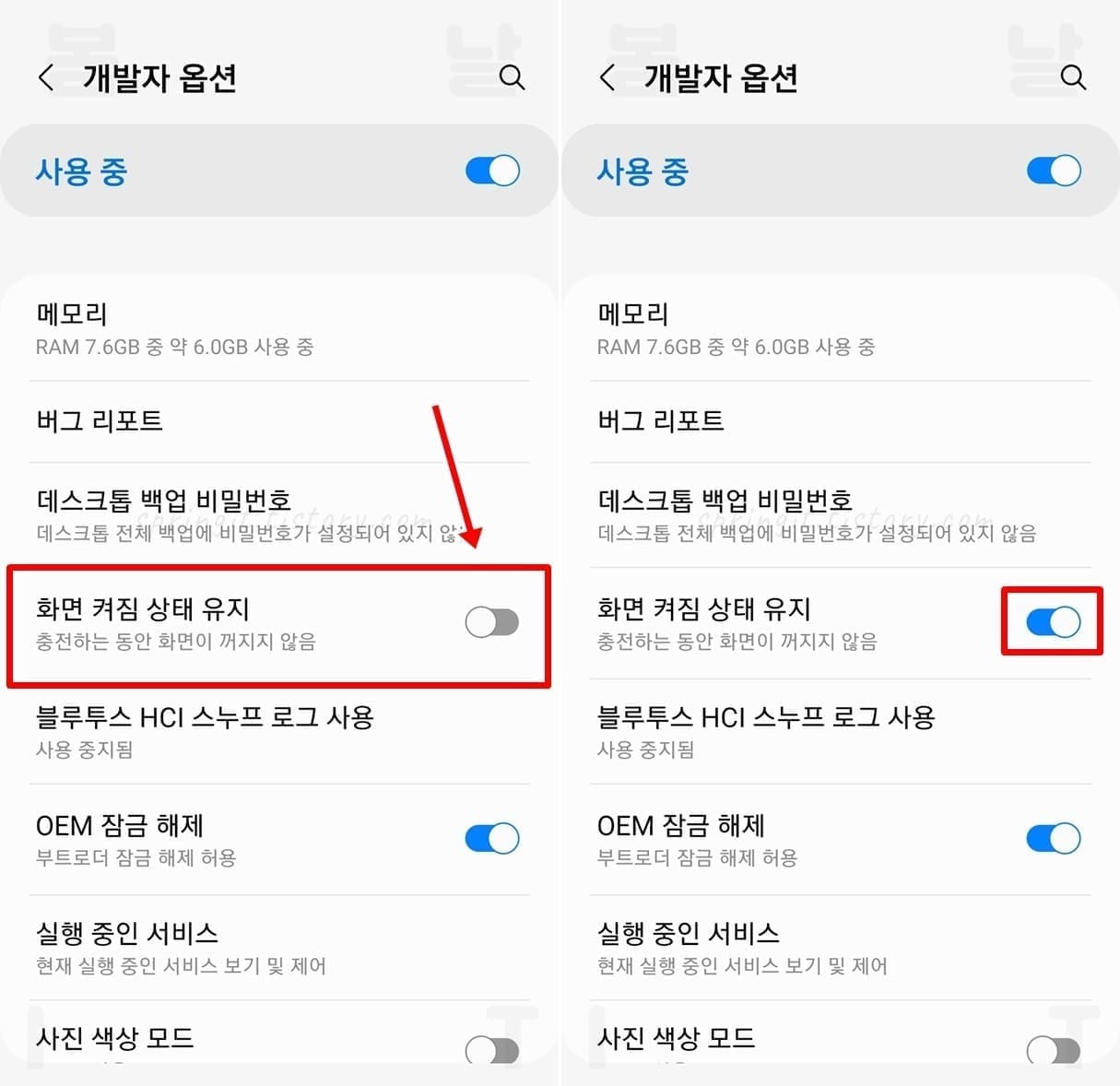 6. 화면 켜짐 상태 유지를 활성화합니다.
