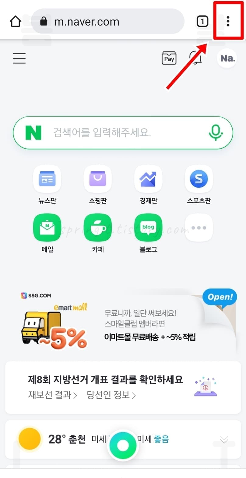 1. 크롬 앱에서 상단 우측 더보기 버튼을 누릅니다.