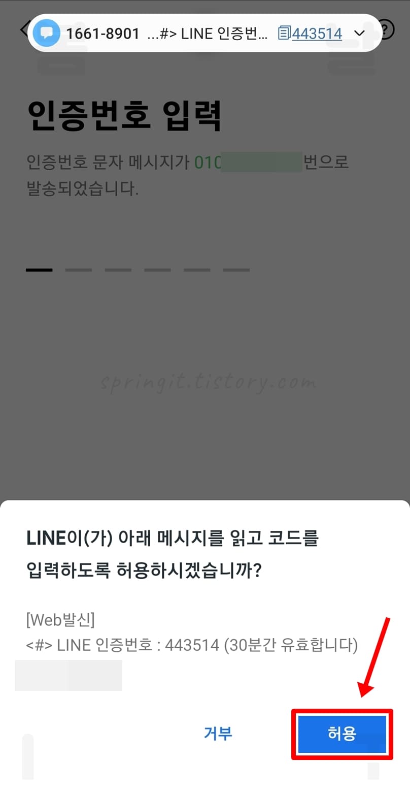 8. 코드 입력창에서 허용을 클릭하면 인증번호가 자동 기입됩니다.